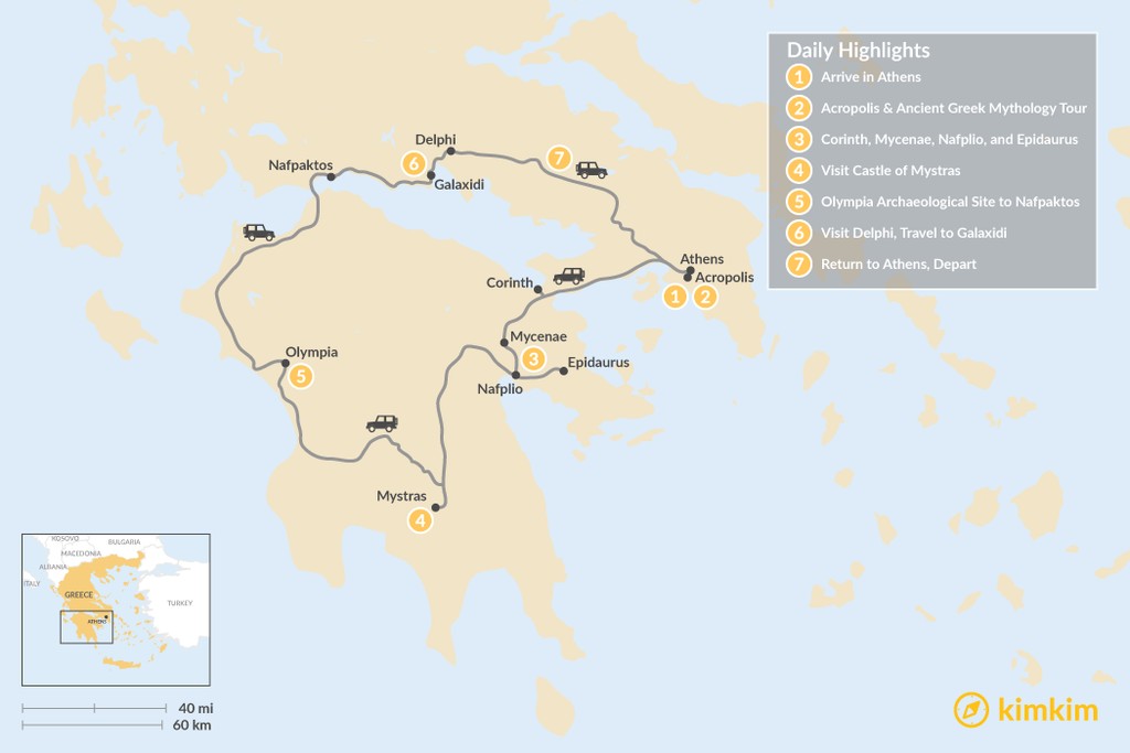 Take a week to drive through the mythological territory of mainland Greece with this itinerary. Your seven days will start and end in Athens, covering the historical sites and sprawling castles of the Peloponnese along the way.