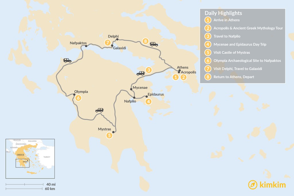 In just over a week, this itinerary will take you from the Acropolis in Athens to the Byzantine ruins of Mystras to the hills of Delphi. Along the way, you’ll visit important archaeological sites, stroll the pretty streets of towns brimming with history and culture, and enjoy unforgettable views.