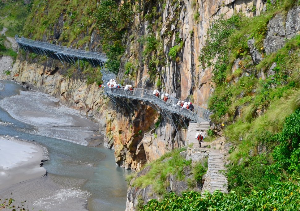 From here, you’ll further climb near a rocky outcrop where the valley opens up next to the river, which flows more peacefully here. Dropping down to the river shore, you’ll walk along rounded stones before climbing over a side ridge. Head down again to the river and cross another suspension bridge to reach the village of Machha Khola.