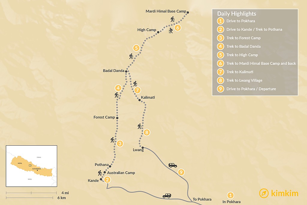 | Day 8 | Mardi Himal Base Camp and back to Middle Camp (8 hours) | Middle Camp |