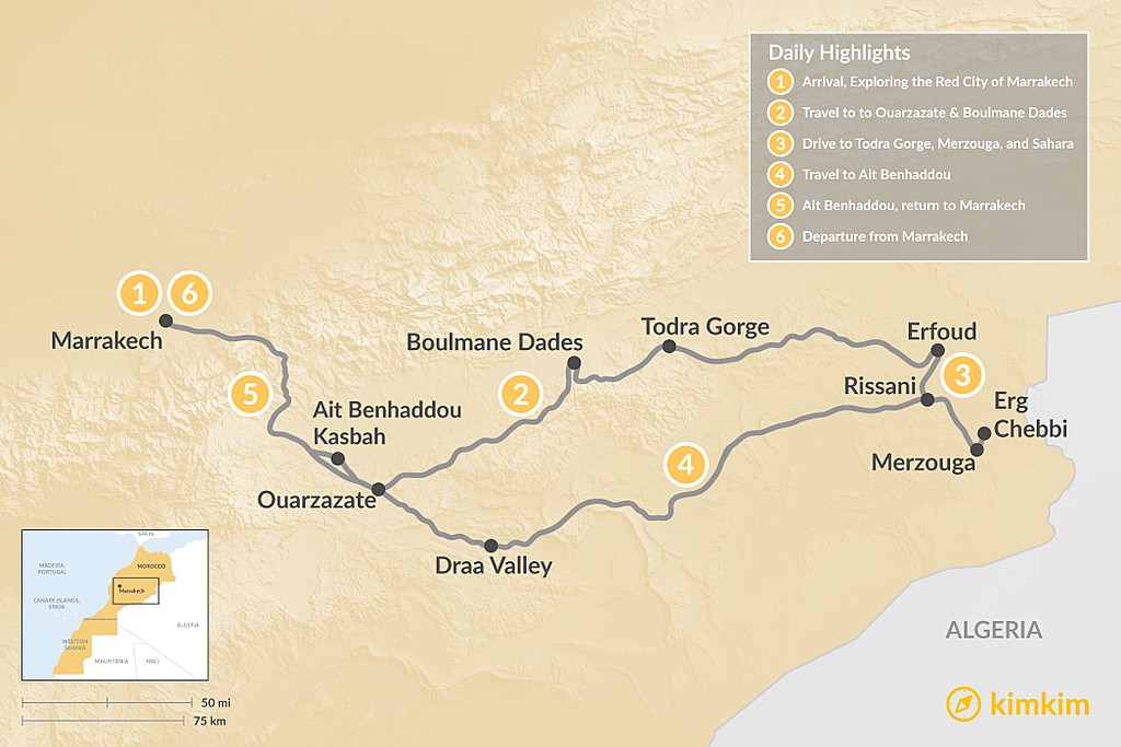 Map of Marrakech & Grand Tour of the Sahara Desert – 6 Days