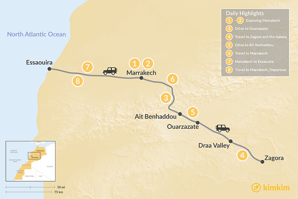 Map of Marrakech, Quick Desert Tour & Essaouira – 8 Days