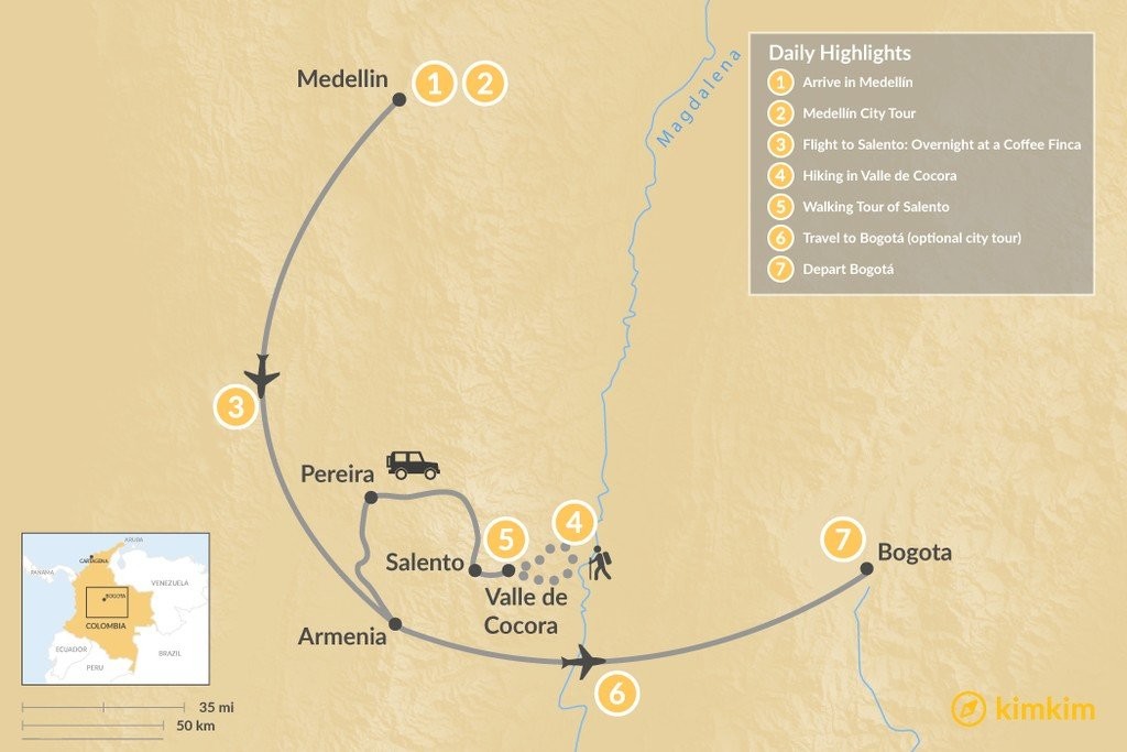 Map of Medellín, Bogotá & the Zona Cafetera – 7 Days