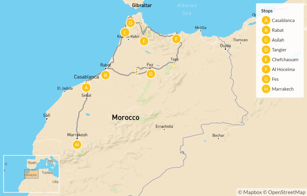 Map of Mediterranean Morocco: Tangier, Al Hoceima & Imperial Cities – 15 Days