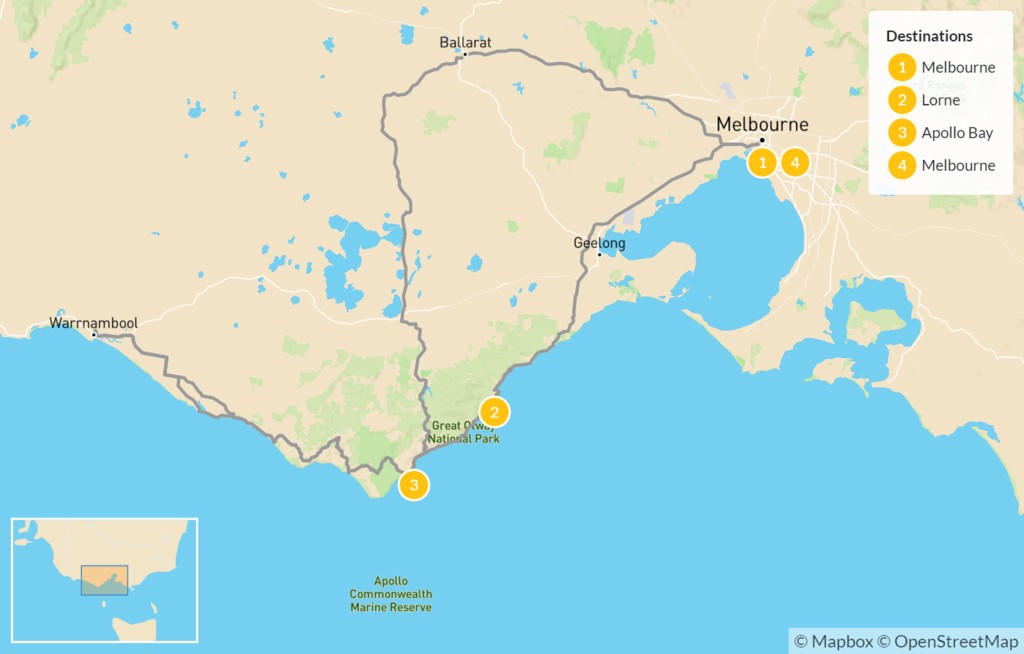 Map of Melbourne to Great Ocean Road: Self Drive Tour – 5 Days