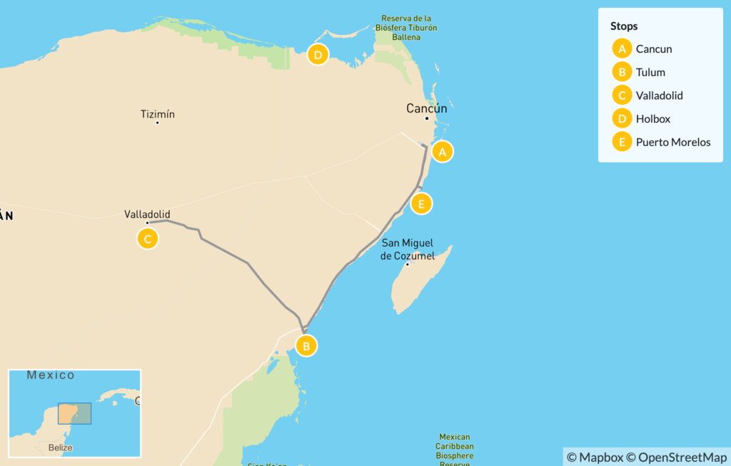 Map of Mexican Culture & Beaches: Tulum, Valladolid, Holbox Island & More – 9 Days