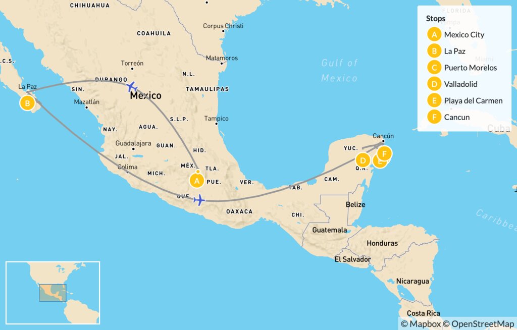 Map of Mexico City, Baja & the Yucatán – 13 Days