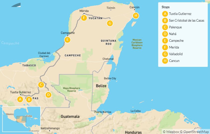 Map of Mexico’s Maya Roads: Temples, Waterfalls & Lagoons – 15 Days