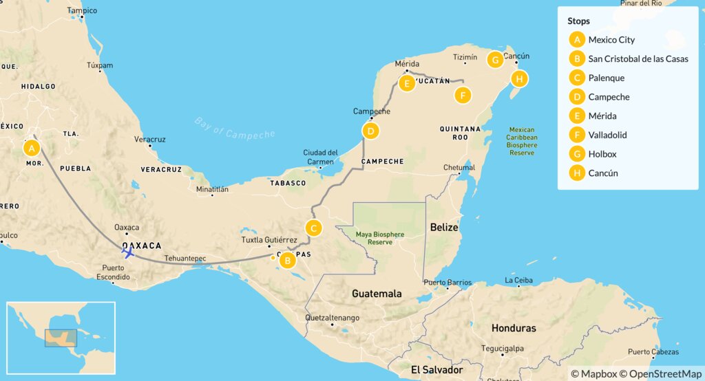 Map of Mexico’s Natural & Archaeological Wonders: Chiapas to the Yucatán – 14 Days