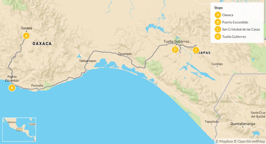 Map of Mexico’s Nature & Culture: Oaxaca, Puerto Escondido & San Cristóbal de las Casas – 10 Days