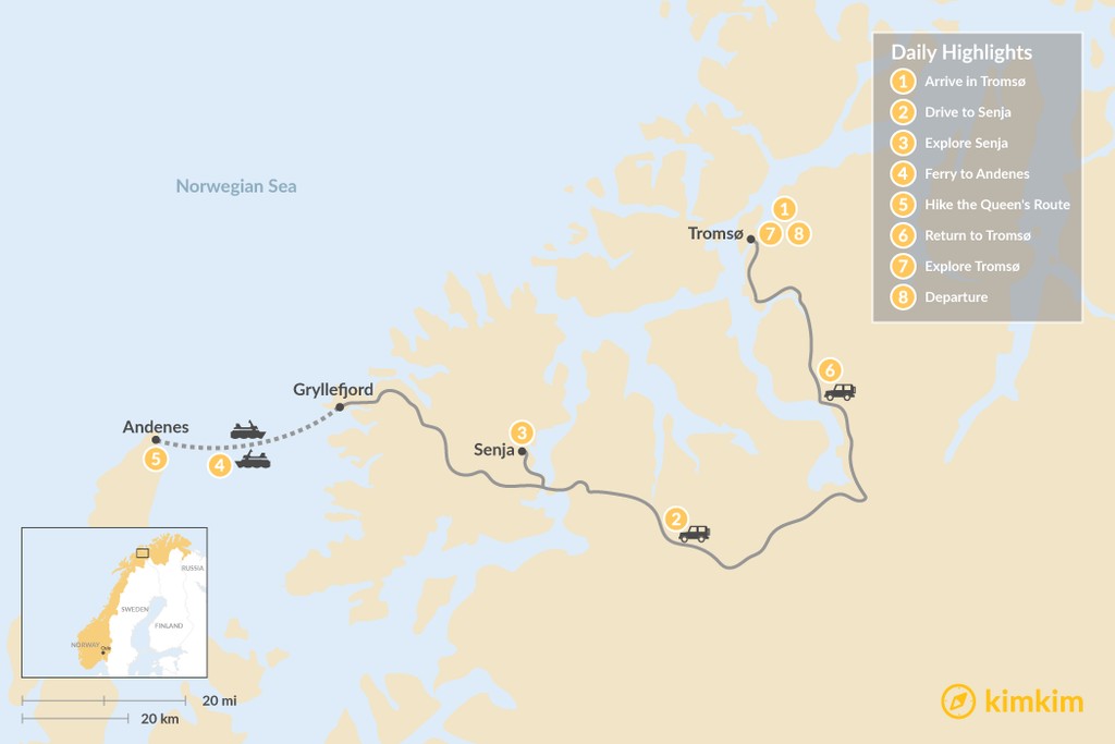 Map of Midnight Sun Road Trip in Arctic Norway – 8 Days