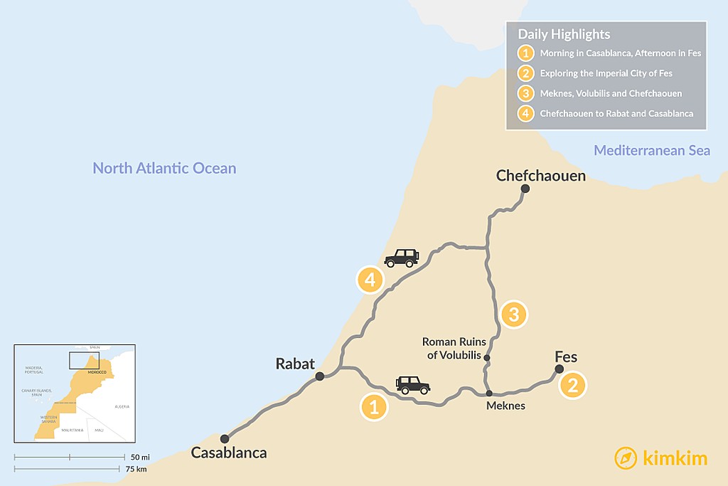 This four-day itinerary focuses on several areas in northern Morocco, from medieval medinas to modern cities. Start in Casablanca and explore imperial Meknes, the cultural capital of Fes, the Roman ruins at Volubilis, and the blue streets of Chefchaouen.