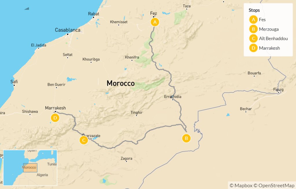 Map of Moroccan Discovery Tour: Cities, Desert & Mountains – 7 Days