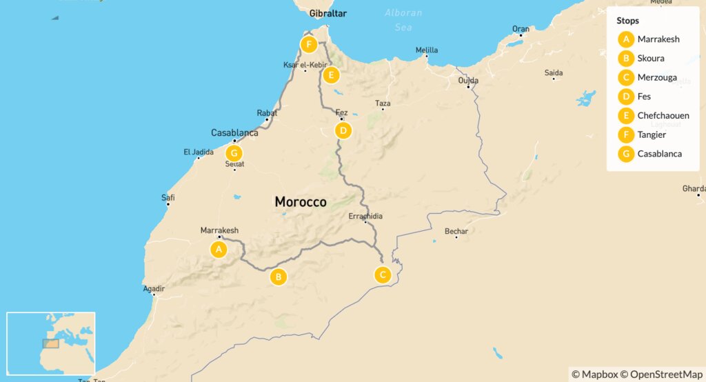 Map of Moroccan Journey of Contrasts: Luxury South to North Tour – 14 Days