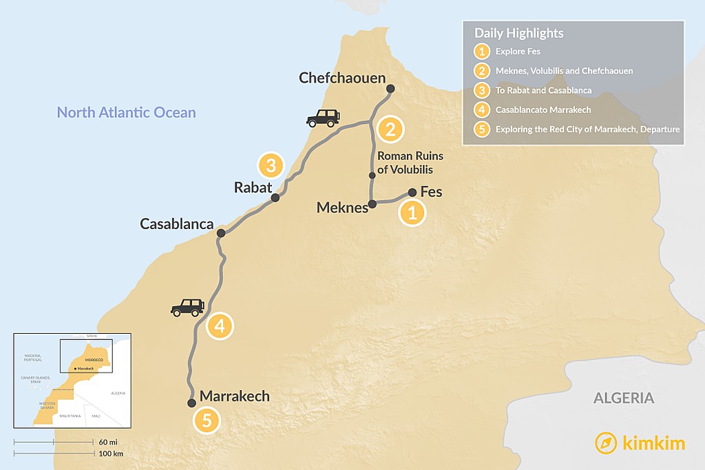 Explore Morocco’s cities with this 5-day itinerary. Featuring the historic cities of Fes, Meknes, Rabat, and Marrakech, as well as the hillside town of Chefchaouen and the coastal city of Casablanca. You’ll walk the streets of medieval medinas, shop souks and bazaars, roam ancient Roman ruins, and marvel at the artistic details of Morocco’s finest buildings.