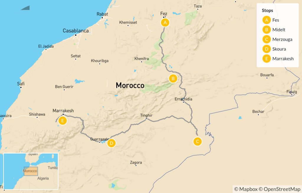 Map of Morocco Family Adventure from Fes to Marrakesh via the Desert – 12 Days