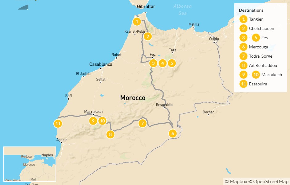 Discover imperial cities and desert adventures with this 12-day circuit from Tangier in the north to Essaouira in the south. Experience the culture and history of Meknes, Fes, and Marrakesh as you navigate narrow and winding streets in ancient medinas, shop artisanal wares in animated souks, and admire the intricate tile work of historic mosques. Explore the desert as you ride a camel over shifting sands in the Sahara, delve into mud-brick fortressed cities, and cross the high rocky peaks of the Atlas mountains.