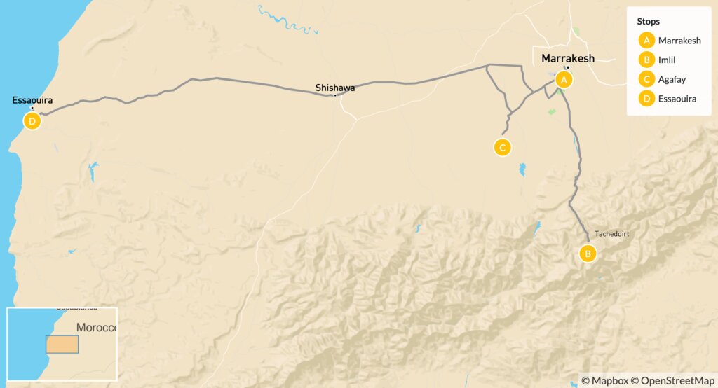 Map of Morocco Luxury Escape: Marrakesh, Imlil, Agafay & Essaouira – 10 Days