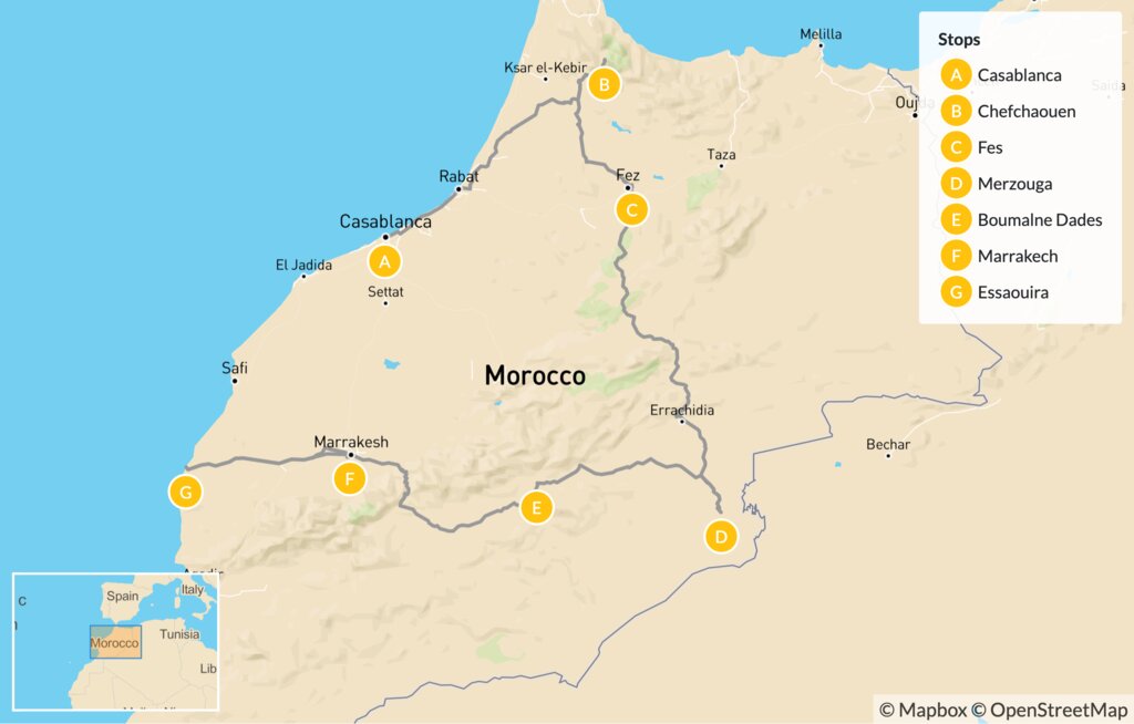 Map of Morocco’s Cities, Coast, Mountains & the Desert – 14 Days