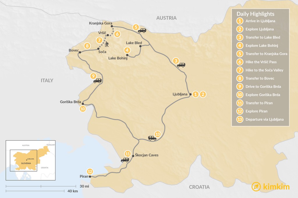 | Day 13 | Drive from Piran to Ljubljana Airport and depart |