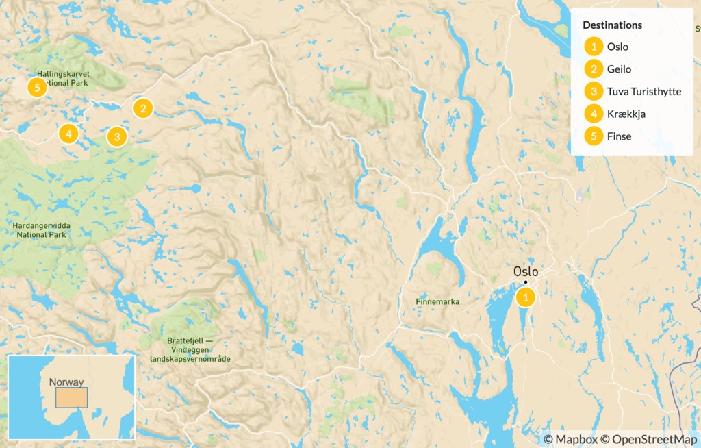 Halfway between Norway’s two largest cities—Oslo and Bergen—lies an extraordinary wilderness area situated between two national parks. This itinerary includes four days of hiking along well-marked trails (becoming more difficult each day) from Geilo to Finse. Start and end the trip with some urban culture and nightlife in the two aforementioned cities to round out this awesome adventure.