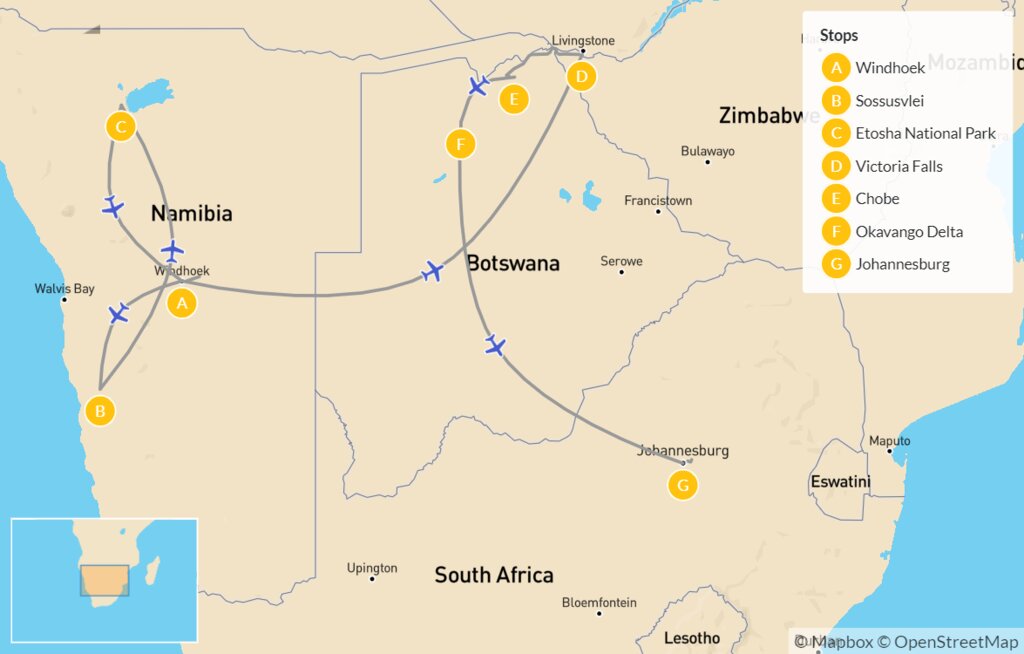 Map of Namibia & Botswana Safari Adventures – 14 Days