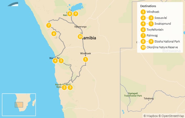 Map of Namibia Self-Drive Explorer: Sossusvlei, Etosha, Swakopmund, & More – 11 Days