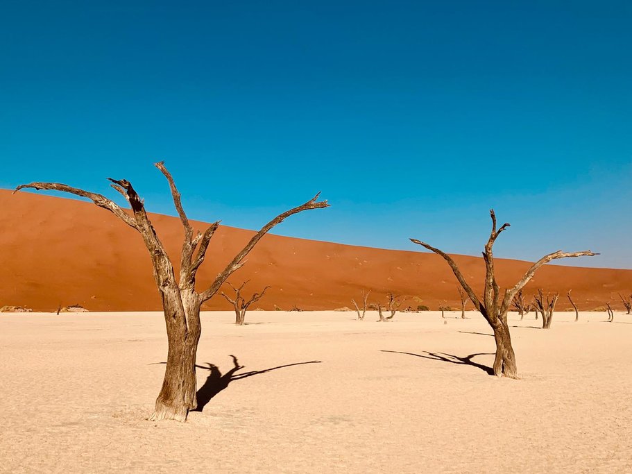 - Explore Deadvlei, is an ancient clay pan, once an oasis, studded with acacias and fed by the river. With a sudden change, of course, it left the earth to dry up along with the trees, previously supported. The climatic conditions were so dry that the trees were never decomposed and were instead entirely leached of moisture. Today, 900 years later, they stand as desiccated, blackened sentinels dotting the pan’s surface. Surrounded by the red-pink dunes in the Namibia Desert, the trees create a surreal spectacle.