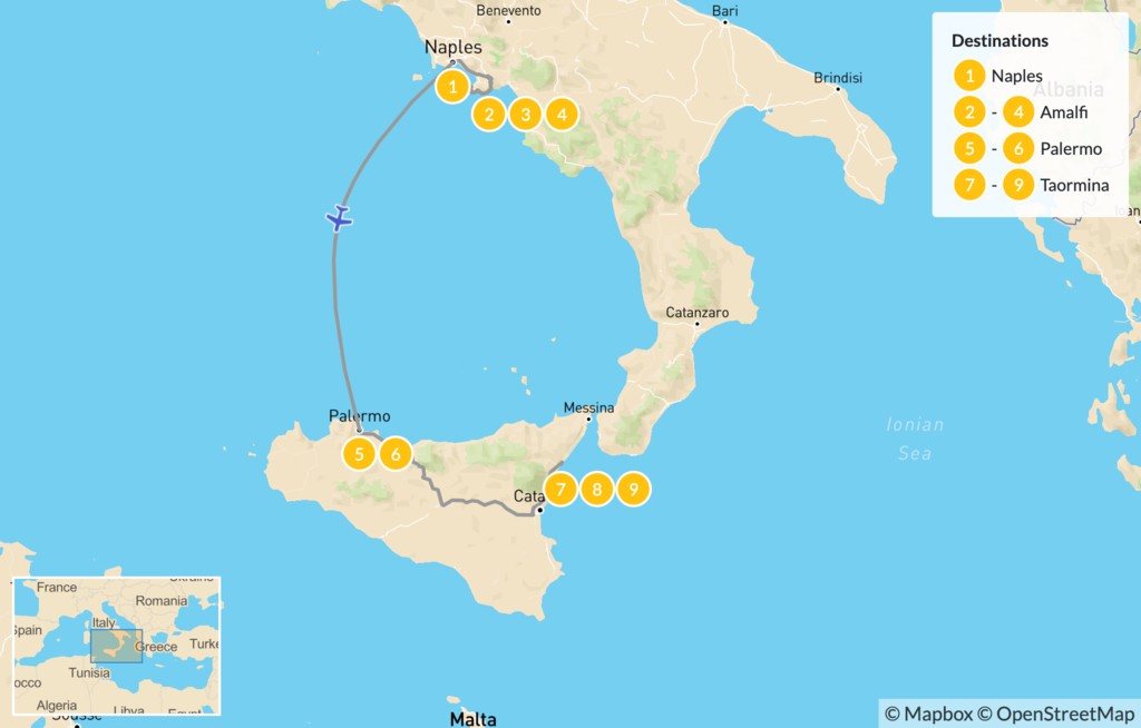 Map of Naples, Amalfi Coast, & Sicily – 10 Days