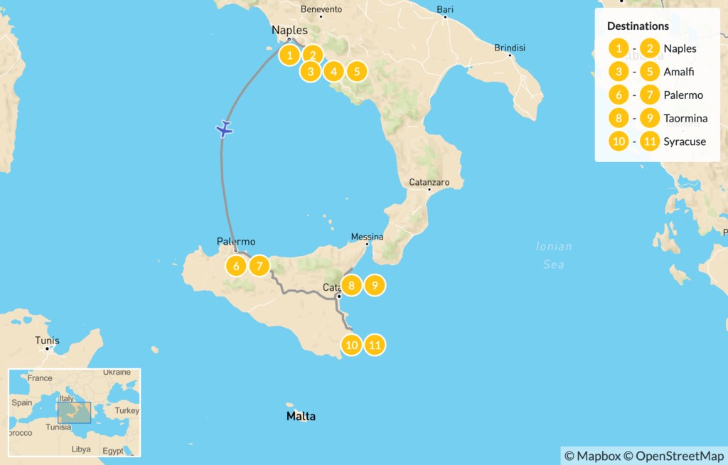 Map of Naples, Amalfi Coast, & Sicily – 12 Days