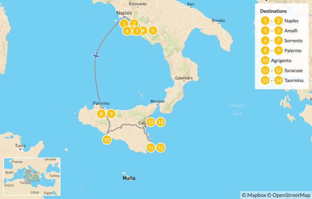 Map of Naples, Amalfi Coast, & Sicily – 15 Days