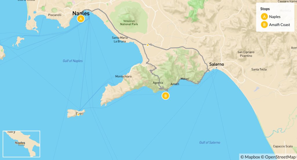 In the morning, you’ll leave Naples and head south to the Amalfi Coast. Along the way, stop to visit the area’s most notable attractions, Pompeii and nearby Mount Vesuvius.