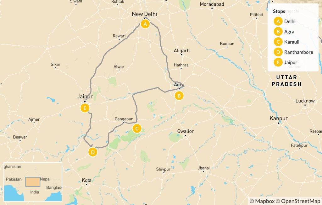 Map of Natural & Cultural Splendors in India: Golden Triangle & Tigers – 9 Days