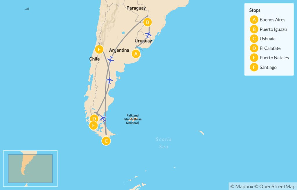 Map of Natural Wonders & National Parks of Argentina & Chile – 16 Days