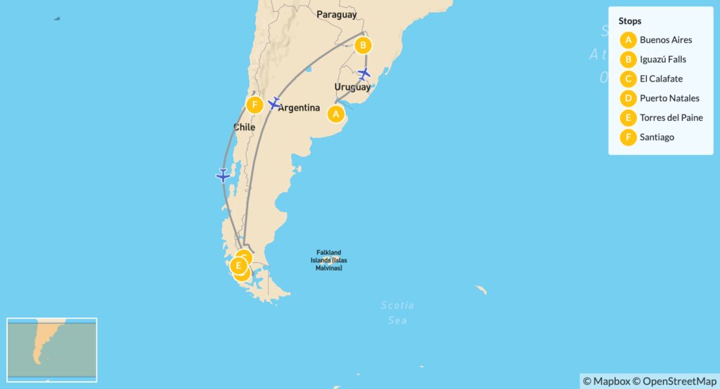 Map of Natural Wonders of Argentina & Chile: Waterfalls, Glaciers & National Parks – 14 Days