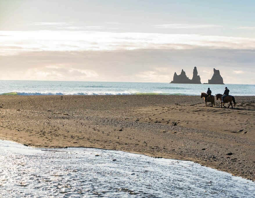 This morning, take the ferry back to Landeyjahöfn and continue along the Ring Road and Iceland’s South Coast. Your final destination is the town of Vík, with several stopping points along the way. Start with Seljalandsfoss waterfall, which is unique in that it is one of the only known waterfalls you can actually walk behind. Access is a fairly easy few-minute walk from the parking lot, and you can stand in a cave under the cliffs and watch the water roaring in front of you. Then, head to nearby Skógafoss, where the waters often create dazzling rainbows, making it one of Iceland’s most photographed falls.