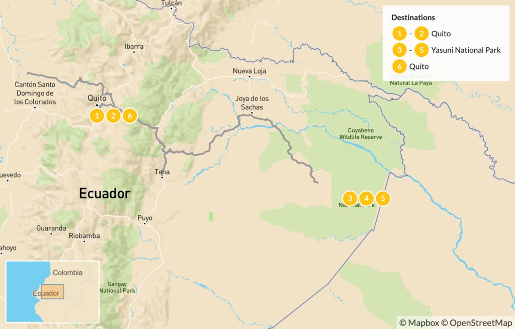 Map of Nature & Culture in Ecuador: Quito and the Amazon Rainforest – 7 Days