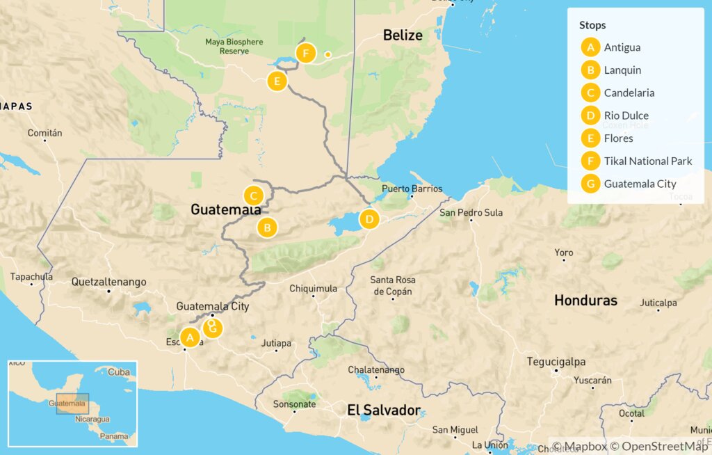 Map of Nature & Culture in Guatemala: Lanquín to Tikal National Park – 7 Days