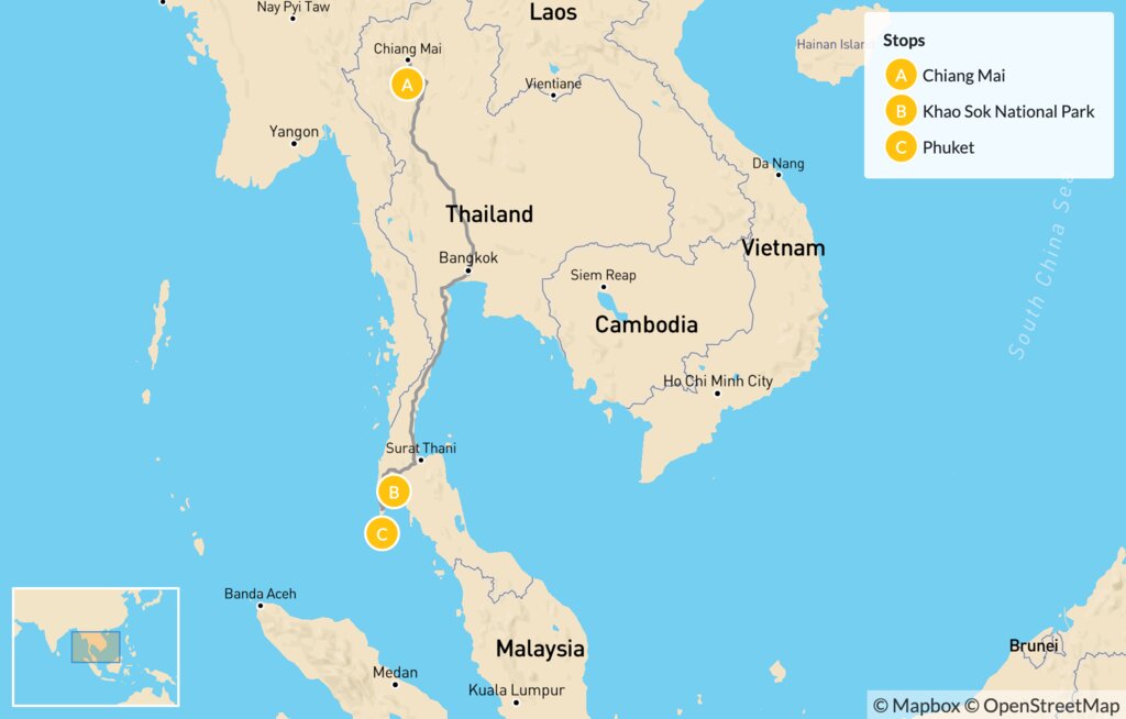 Map of Nature & Culture in Thailand: Chiang Mai, Khao Sok National Park & Phuket – 7 Days