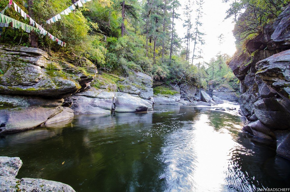 Leaving Trongsa, the road winds north west via Tsamkhar to cross Mangde Chu River at Bjizam. Pass through farmland and villages, and cross the Pele La Pass (11,220 feet/3,420 m.).