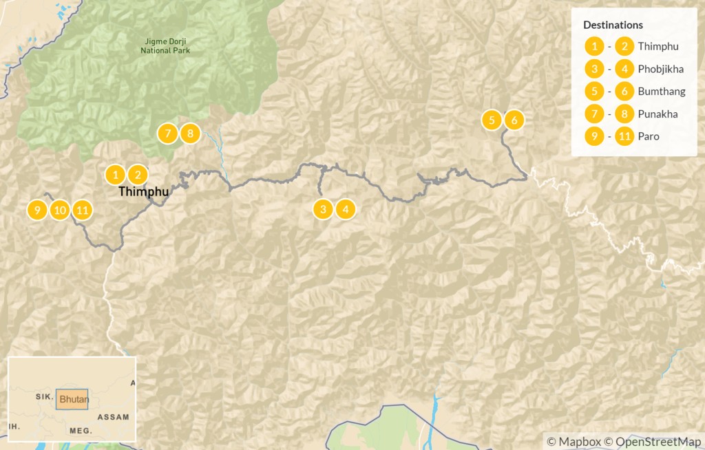 Map of Nature & Culture in Western & Central Bhutan – 12 Days