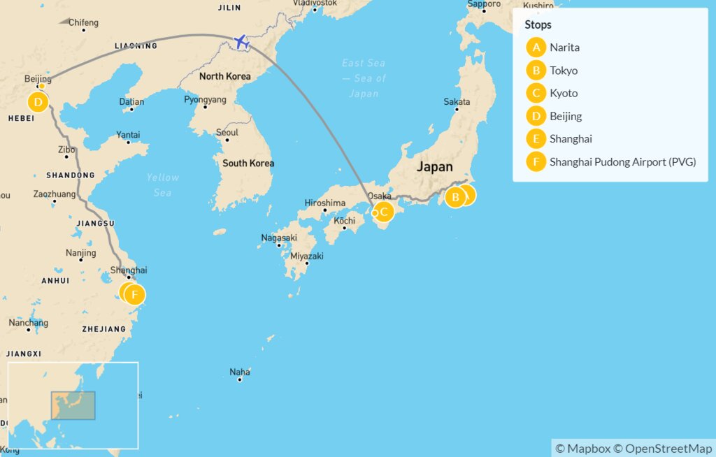 Map of Nature & Culture Tour of Japan & China: Tokyo, Kyoto, Beijing & Shanghai – 10 Days
