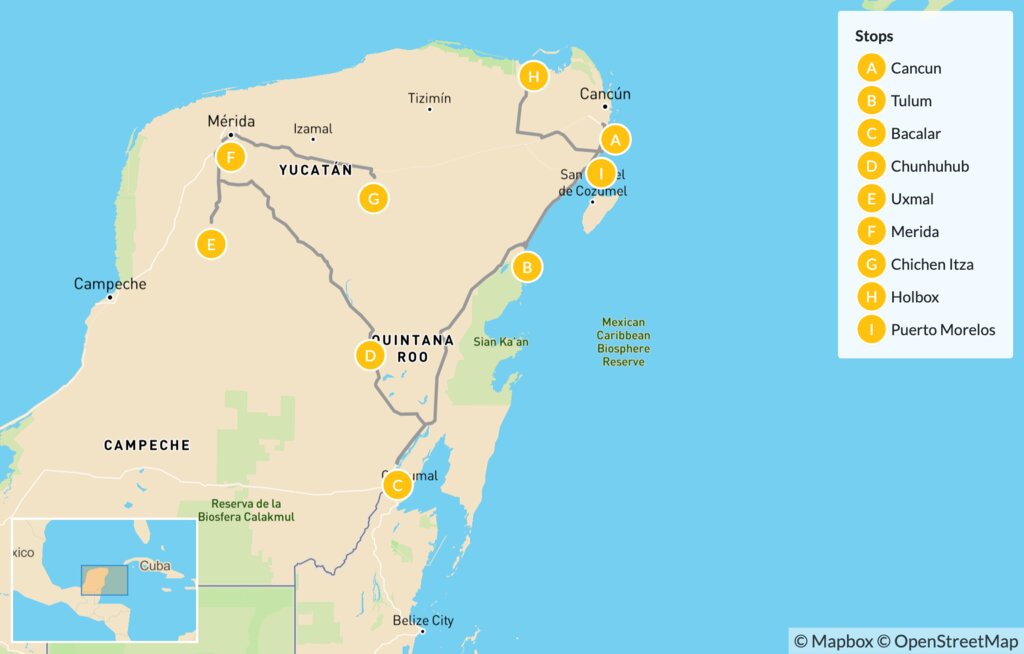 Map of Nature & Maya Culture in the Yucatán – 15 Days