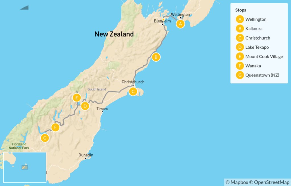 Map of Nature-Packed New Zealand Family Road Trip: Wellington & the South Island – 14 Days