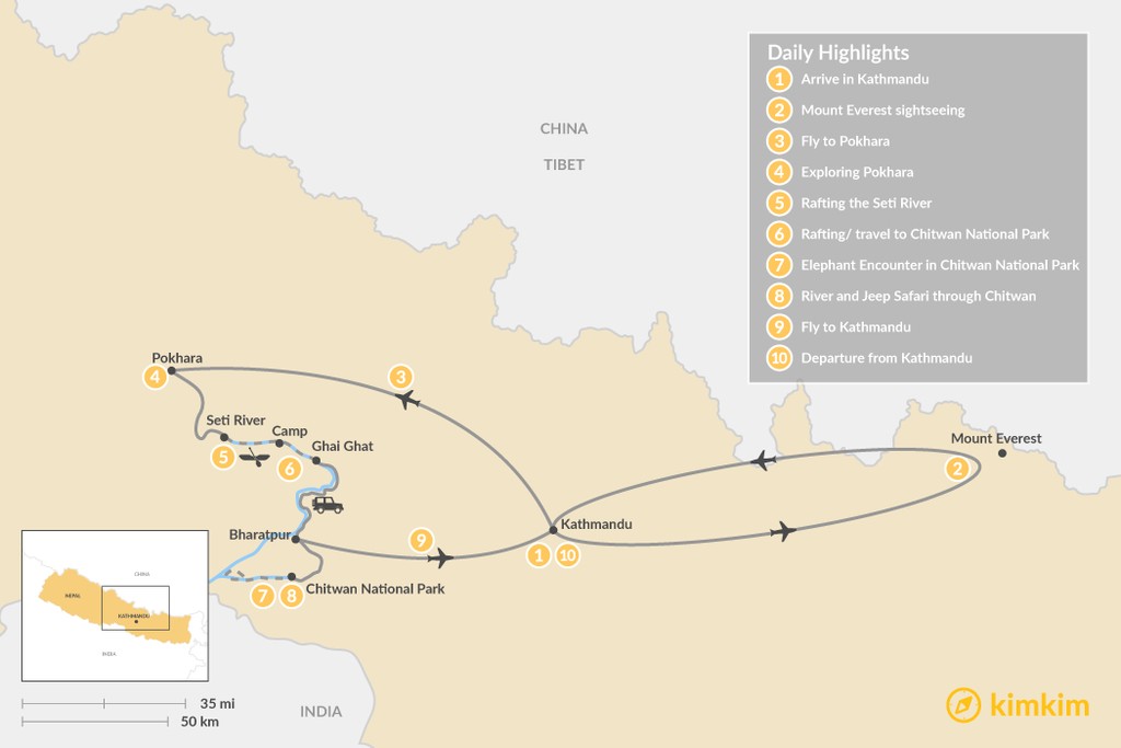Map of Nepal Adventure: Rafting & Safari – 10 Days