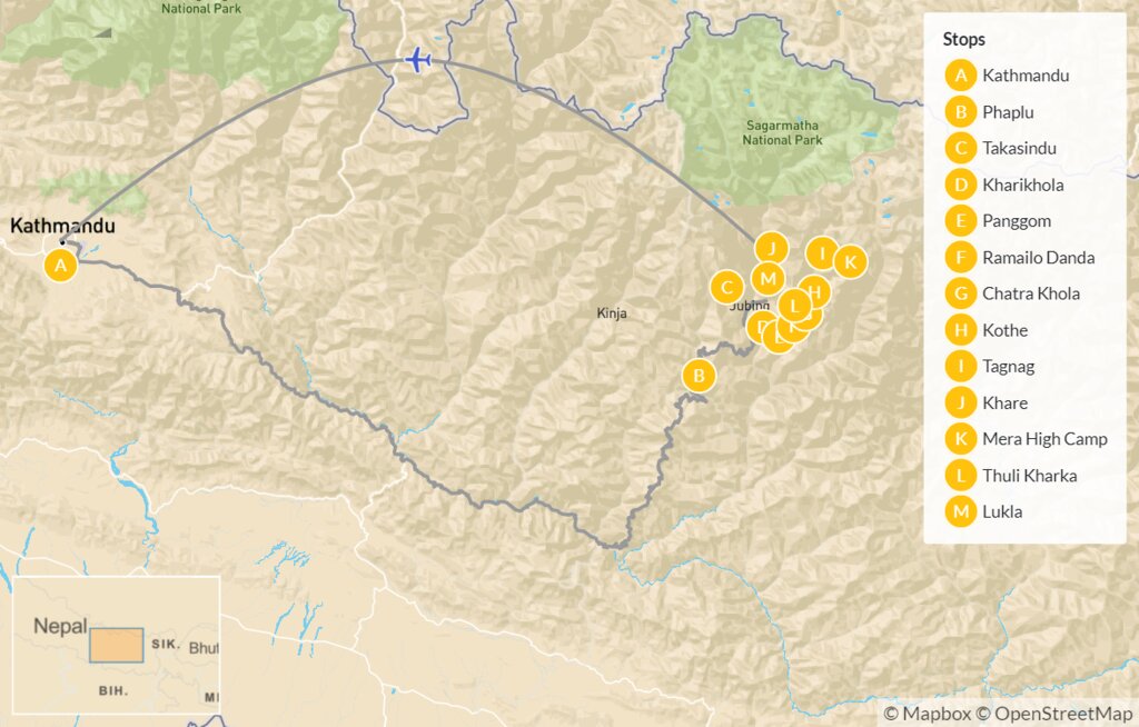 Map of Nepal’s Mera Peak Summit Hike – 20 Days