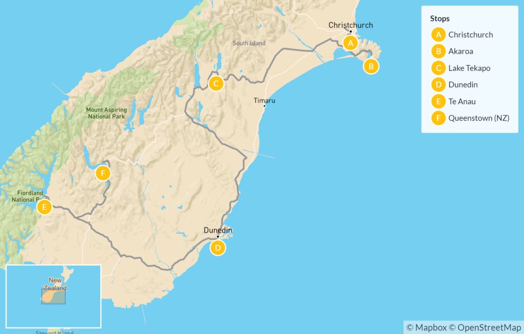 Map of New Zealand Family Nature & Wildlife Tour: Christchurch to Queenstown – 14 Days