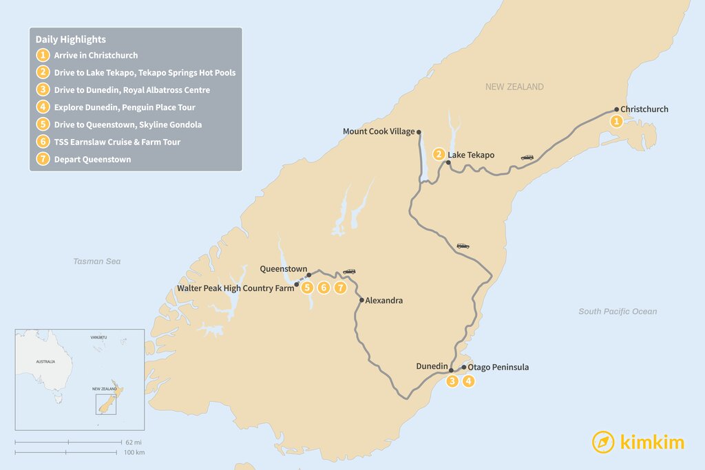 Map of New Zealand Family Road Trip: South Island Mountains & Lakes – 7 Days