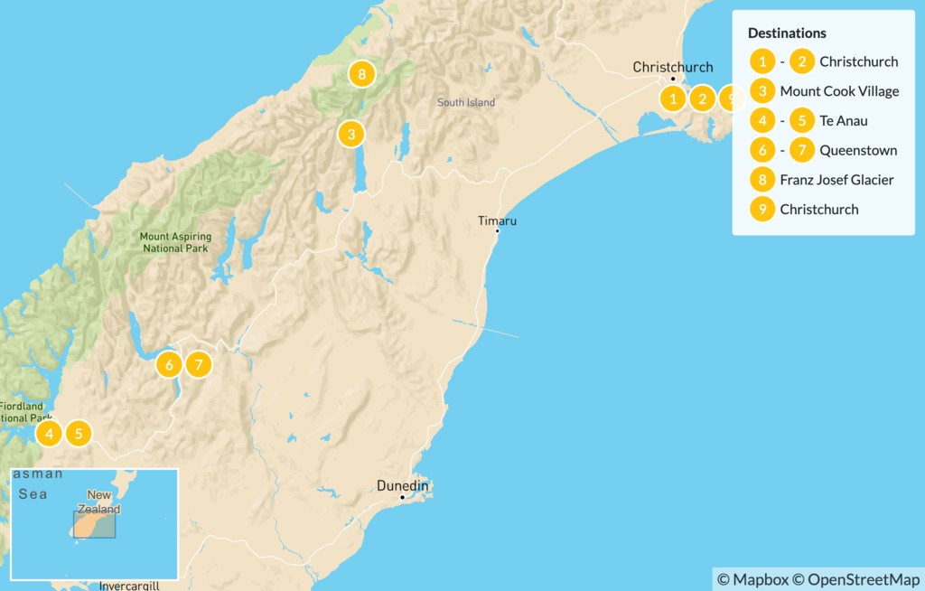 Map of New Zealand: Fjords, Glaciers & Mountains Self-Drive Tour – 10 Days