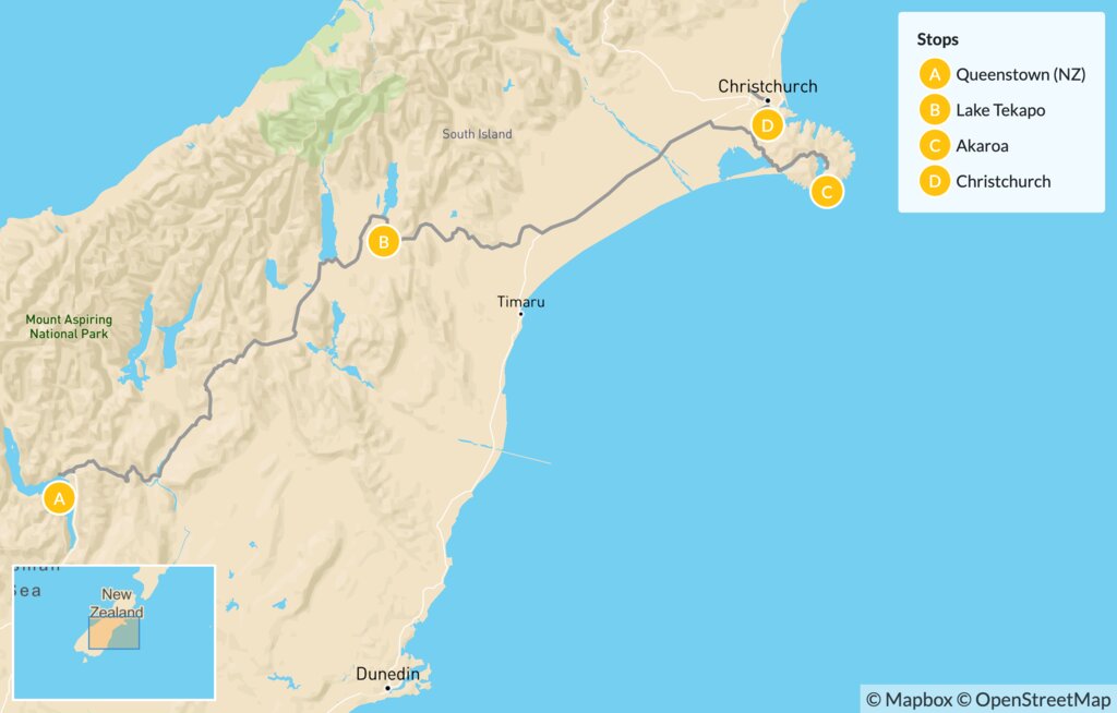 Map of New Zealand Honeymoon Road Trip on the South Island – 7 Days